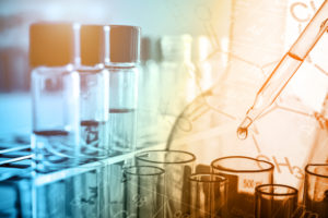 Dropping chemical liquid to test tube with lab glassware background. Science or chemistry research and development concept.